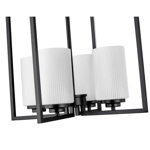 About This Product:A true statement piece for any kitchen or entryway, the Luxx family of pendant lighting incorporates angular lines to provide a dramatic framework for the 4-lights and the ribbed etched, opal white glass globes. Available in either matte black or brushed nickel, the profile evokes a dramatic and contemporary homage to classic suspended-style lanterns. Bulbs are not included.